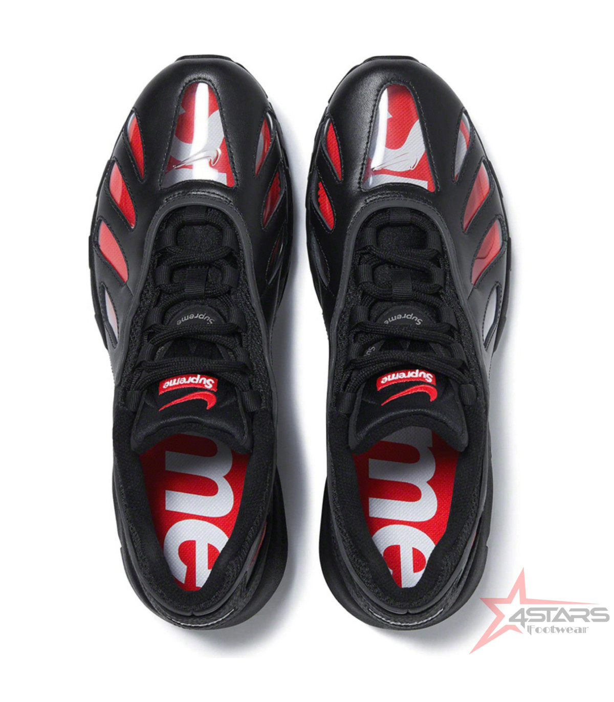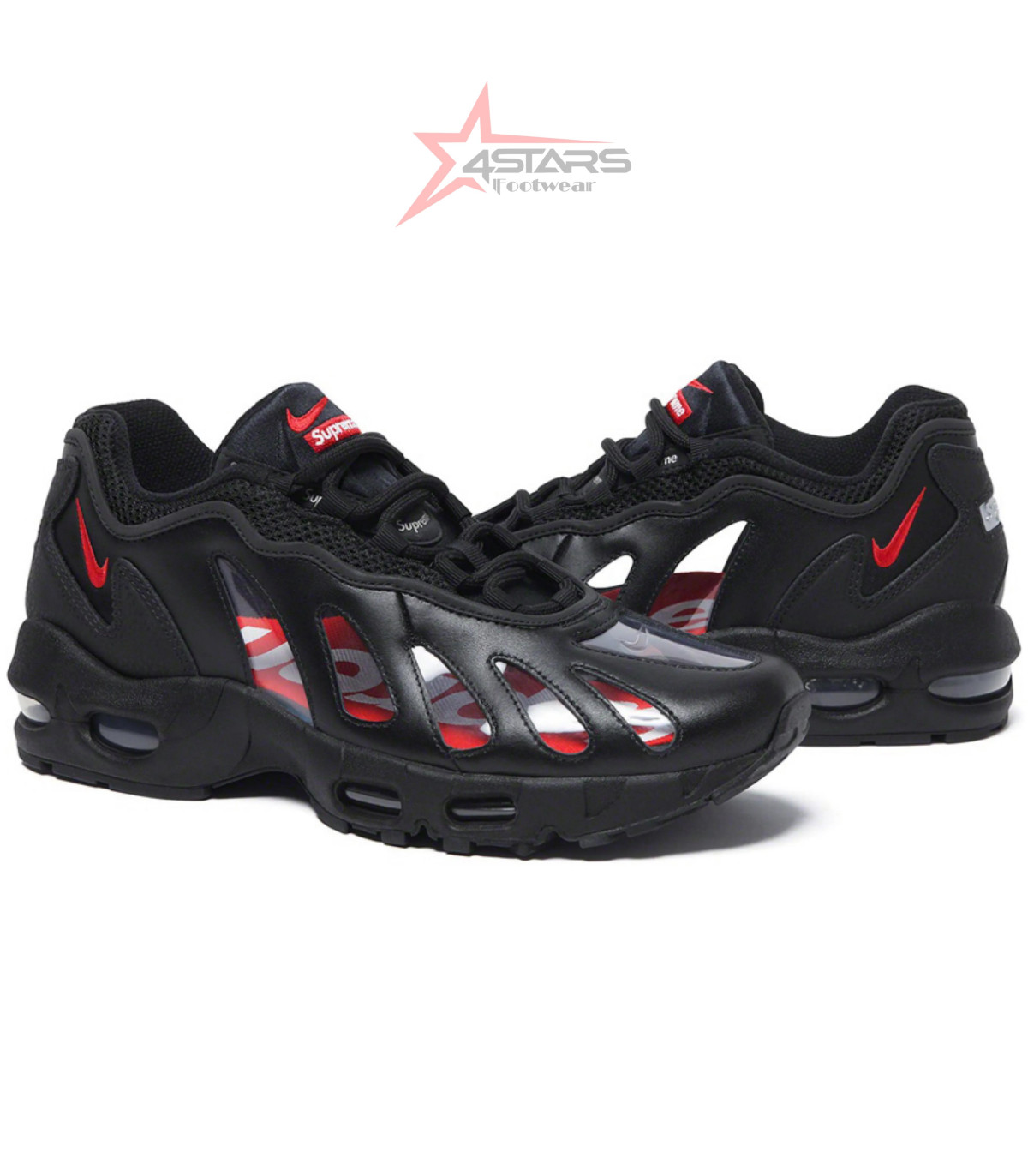 Shop the Supreme x Nike Air Max 96 Black at the best price in Kenya from Forstars Footwear — bold translucent detailing, premium black leather, red accents and visible Air cushioning for standout comfort and style.