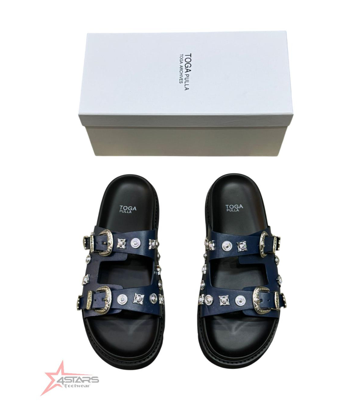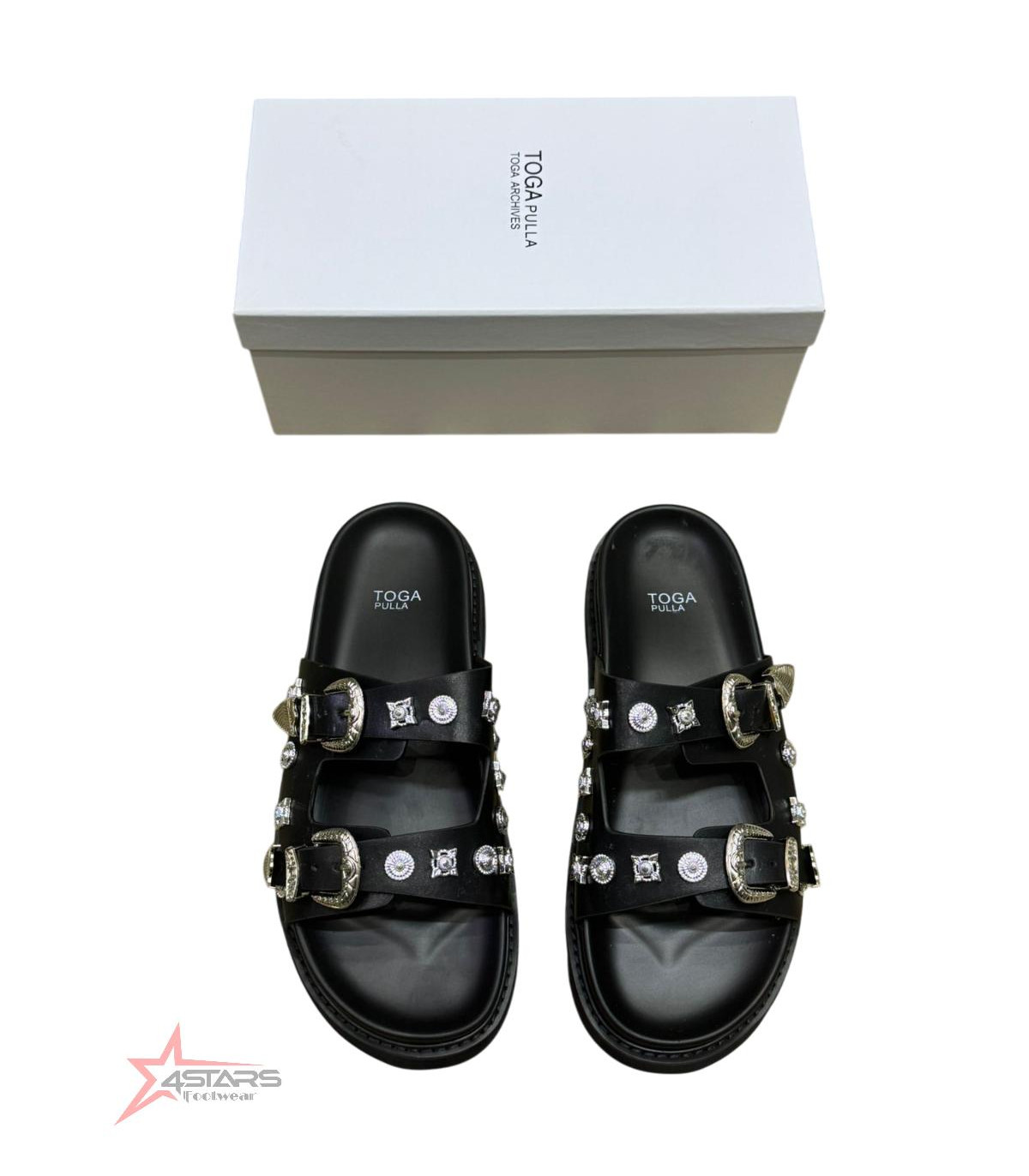 Shop the Toga Virilis Pulla Sandals in black — featuring double buckle fastening, stud detailing, and a moulded leather footbed for comfort and edge. Available now with worldwide delivery.